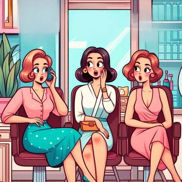 Three women are sitting in a beauty parlor, chatting about their husbands.