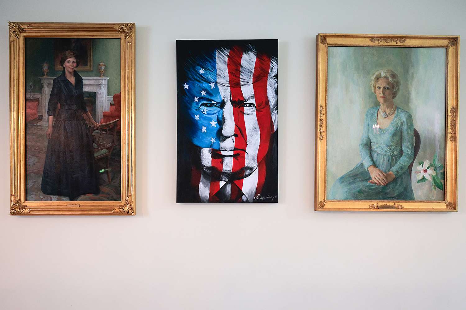 Then, crammed in between Nixon and a portrait of another former first lady, Laura Bush, a new portrait was added: a depiction of Trump’s face overlaid with the American flag.